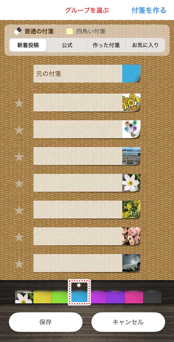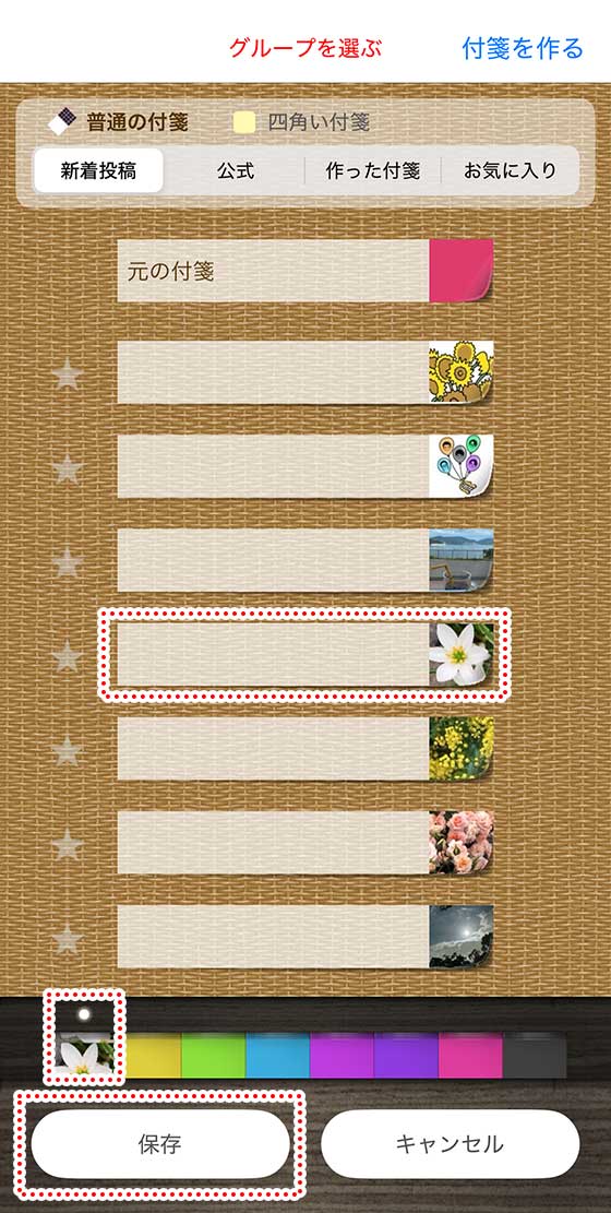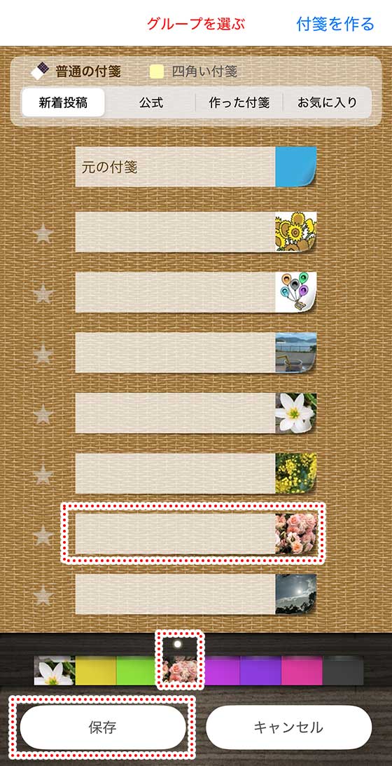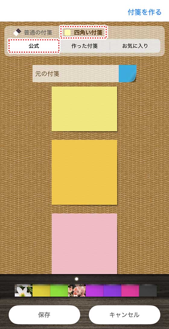 使いたい付箋の柄が見つかったら、その付箋をタップします。すると、下の付箋一覧にセットされます。