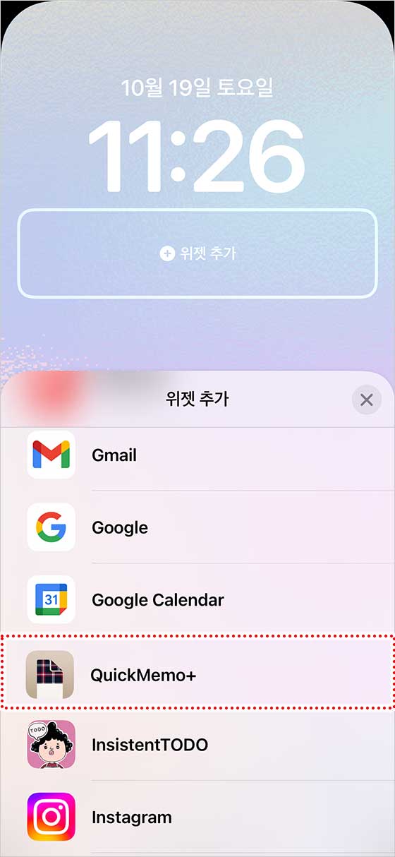 잠금 화면에 추가할 수 있는 앱 목록이 나올 거예요. ‘QuickMemo+’를 찾아 선택하세요.