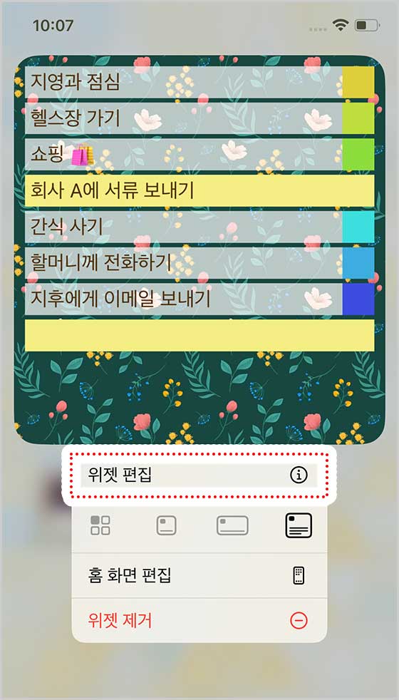 위젯을 길게 눌러 메뉴를 열고, ‘위젯 편집’을 선택하세요.