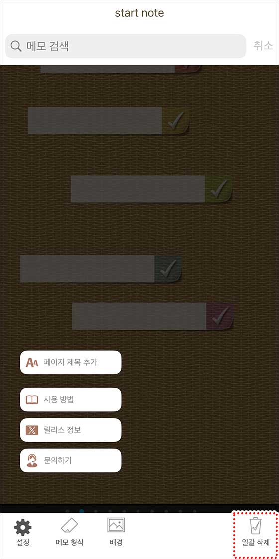 그다음 화면을 탭하고, 오른쪽 메뉴에 있는 ‘일괄 삭제’ 버튼을 눌러 체크된 메모지를 모두 삭제하세요.
