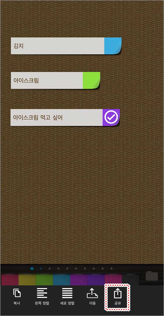 먼저, 보내고 싶은 내용이 있는 메모지를 길게 누르고 나타나는 메뉴에서 ‘공유‘를 탭하세요.