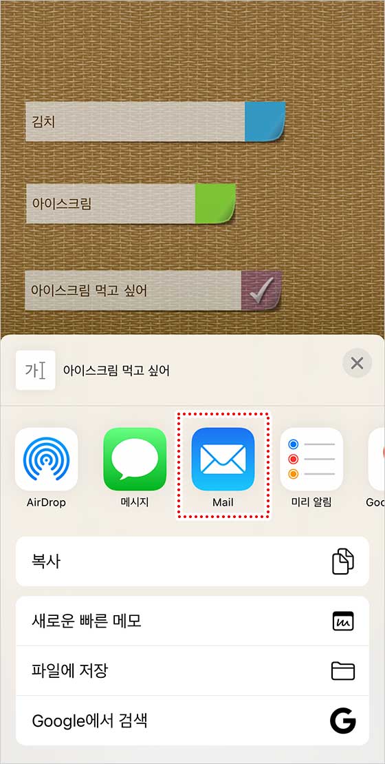 그다음 아래에서 새로운 메뉴가 나타나면 ‘메일‘을 탭해서 이메일로 보낼 수 있어요.