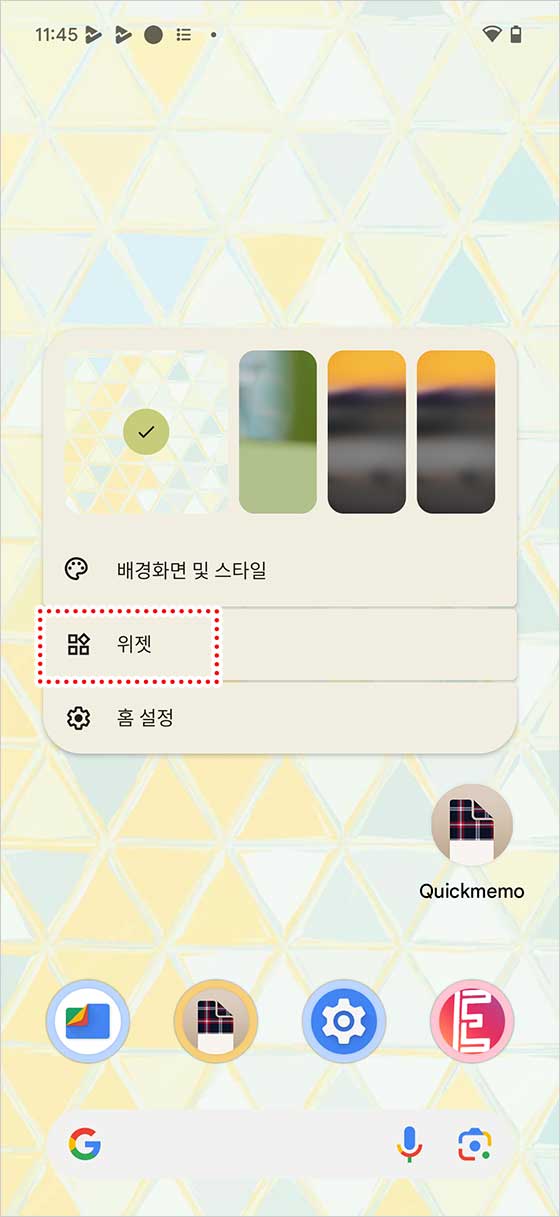 좋아, 방법은 이거야: 홈 화면에서 “배경”을 길게 눌러서 “위젯” 버튼을 탭해.