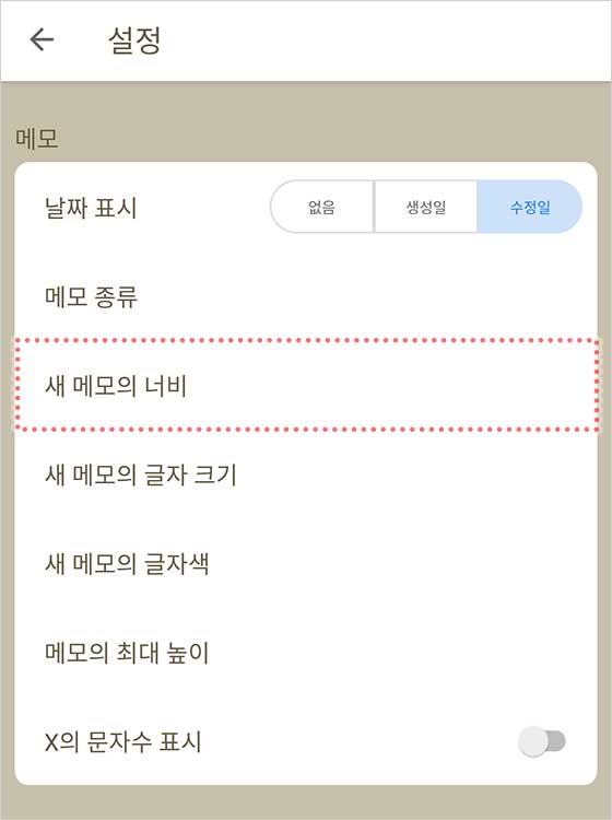 이제 새 메모의 너비 설정 화면이 나와.