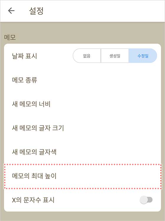 설정 화면이 열릴 거야. 아래로 스크롤해서 “메모의 최대 높이”를 탭해.