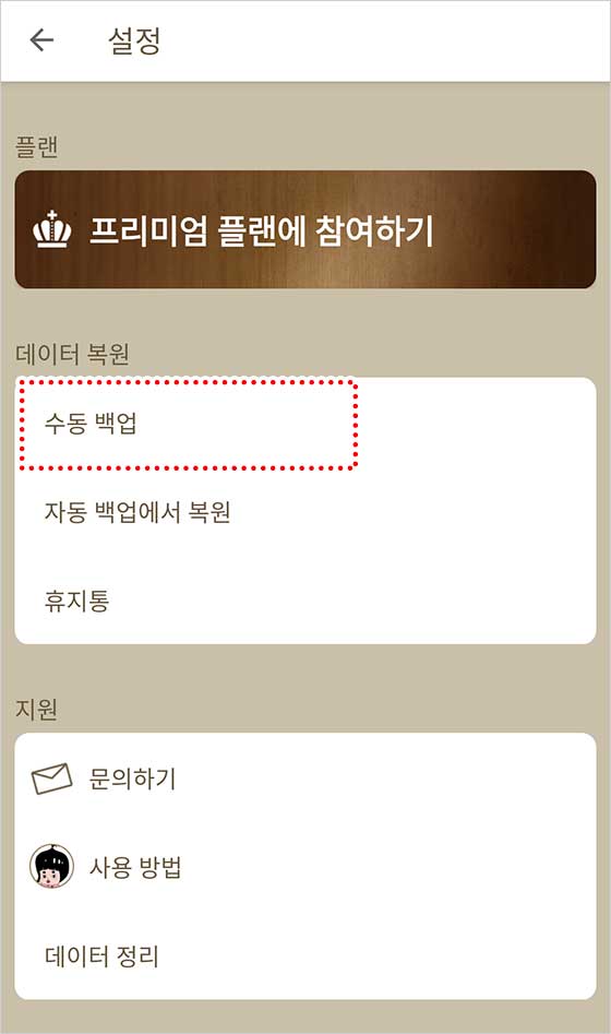 먼저, 설정 화면으로 가서 “수동 백업”을 선택해.