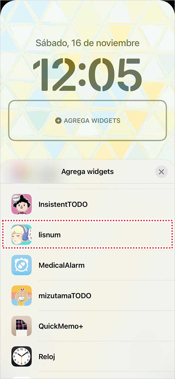 Verás una lista de apps que puedes añadir a la pantalla de bloqueo. Selecciona “Lisnum”.