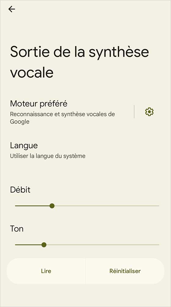 Une fois dans l’écran “Paramètres de la synthèse vocale”, appuyez sur l’icône d’engrenage en haut à droite.