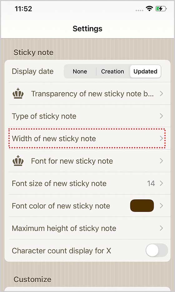 Lalu, layar ‘Pengaturan‘ akan muncul. Gulir ke bawah dan tap ‘Lebar Catatan Tempel Baru.’