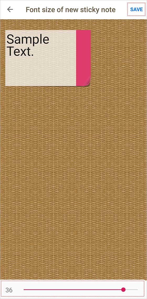 Gunakan bilah pengaturan ukuran di bagian bawah layar untuk memilih ukuran font yang kamu sukai untuk catatan baru, lalu ketuk tombol “SIMPAN” di kanan atas.