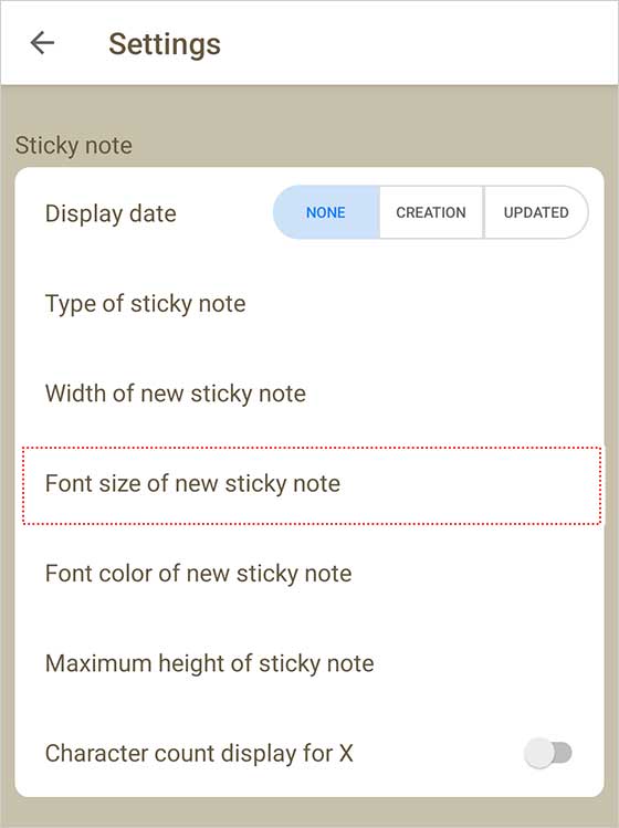 Ini akan membuka pengaturan ukuran teks untuk catatan tempel baru.