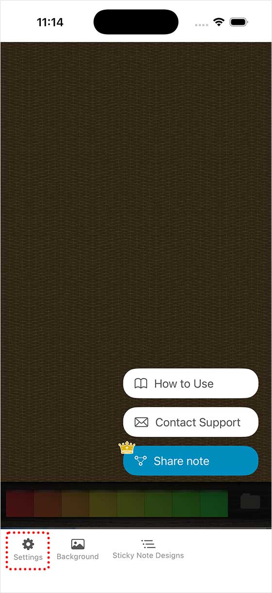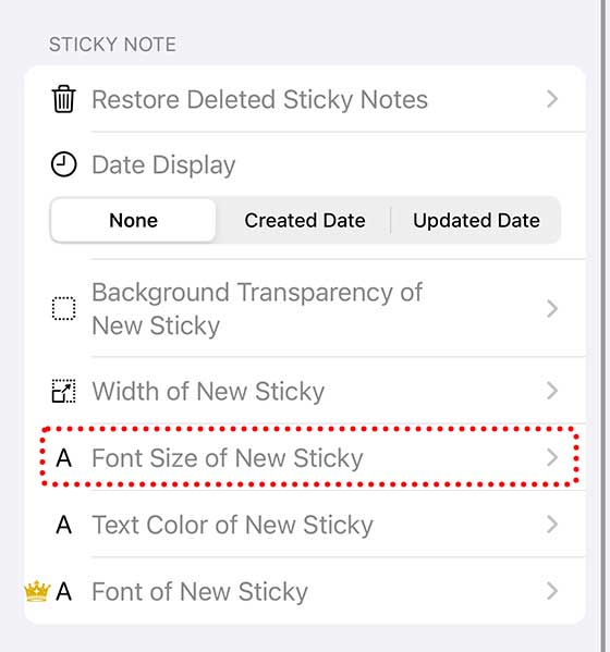 Next, the ‘Settings’ screen will pop up. Scroll down and tap ‘Font Size of new sticky note.’