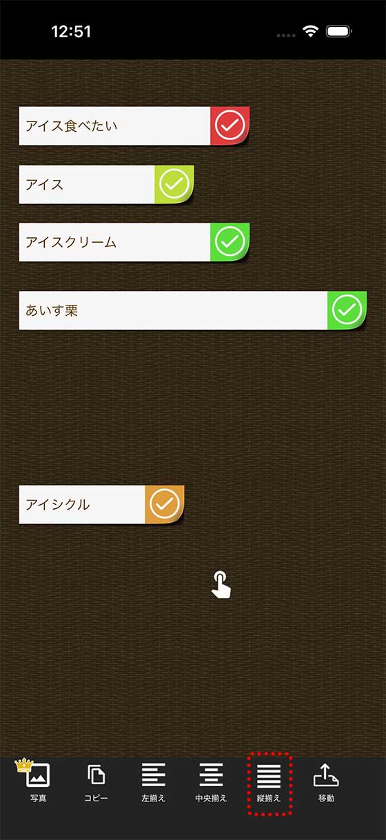 縦も綺麗にそろえたい場合は、背景を長押しして出てくるメニューの「縦揃え」をタップします。