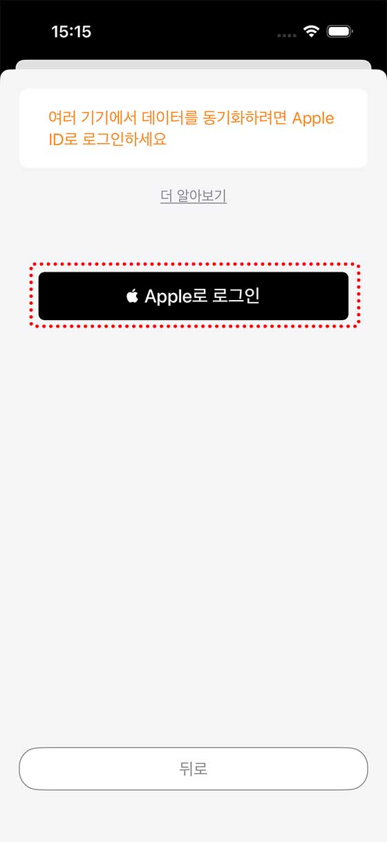 다음 화면에서 “Apple로 로그인”을 선택하고, 본인의 Apple ID로 로그인합니다.